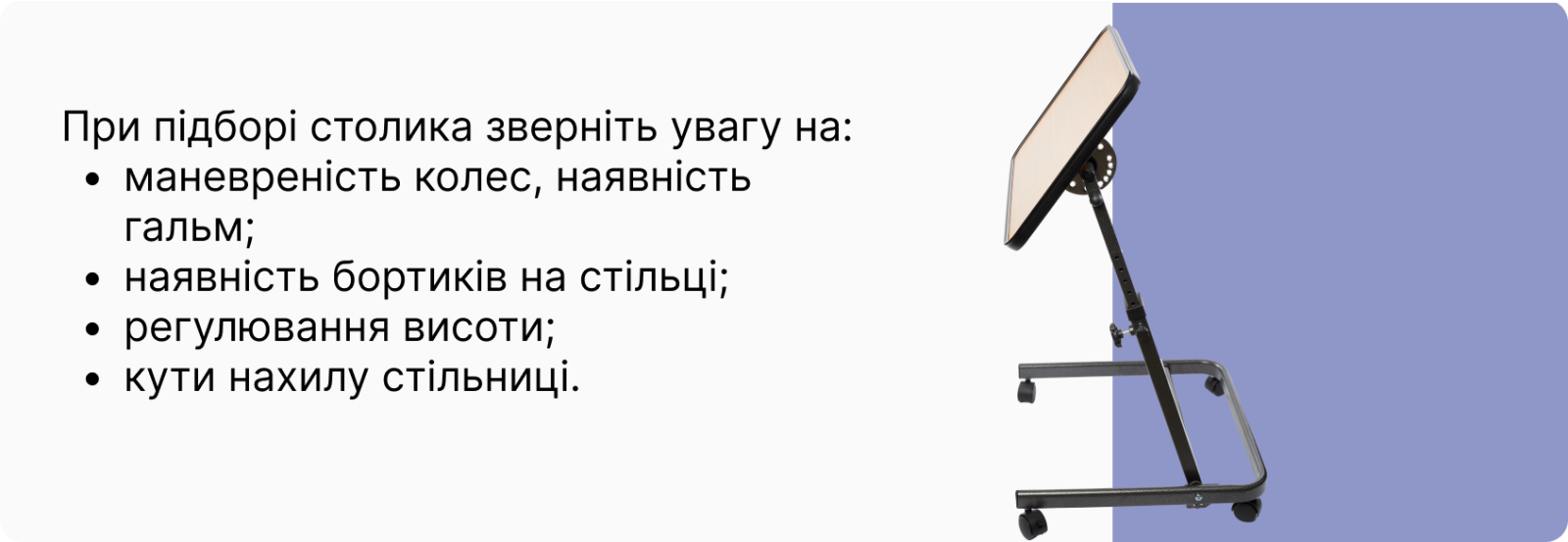 Прикроватний стіл призначений для догляду за пацієнтами, які перебувають у ліжку, пацієнтами з ураженням опорно-рухового апарату. Особливість столика полягає в тому, що він має спеціальну конструкцію для зручного використання навіть у колісному кріслі.