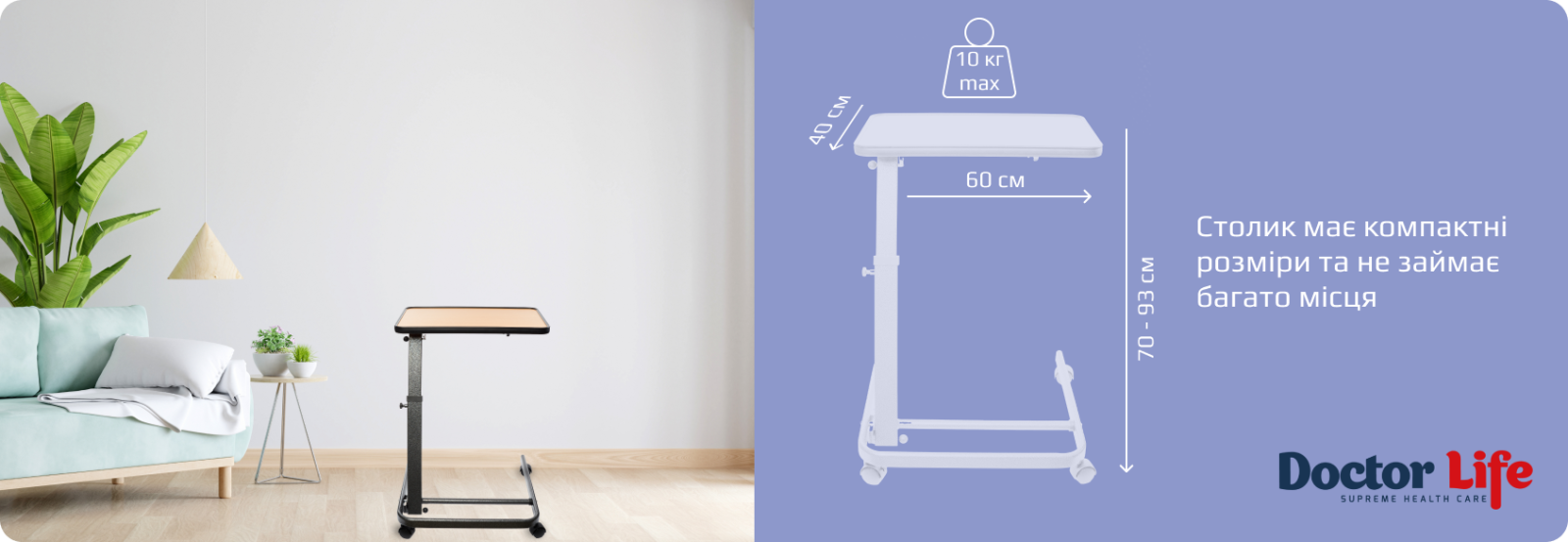 Завдяки спеціальній конструкції стіл може використовуватися, як для ліжка так і для крісла колісного.